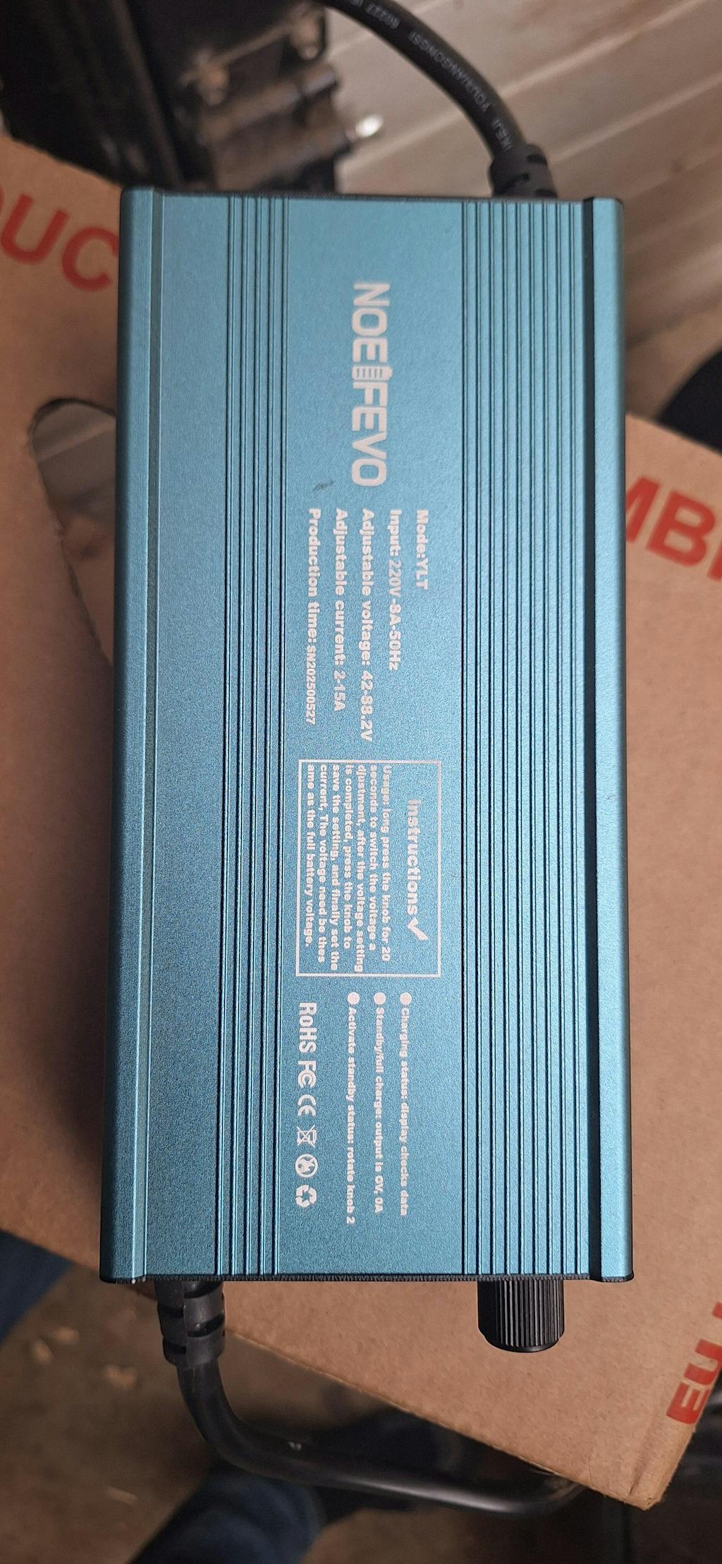 Ładowarka odpowiednia do akumulatorów litowych (w tym akumulatorów LiFePO4) od 36V do 84V. Przed ładowaniem należy dostosować napięcie ładowania do typu akumulatora.