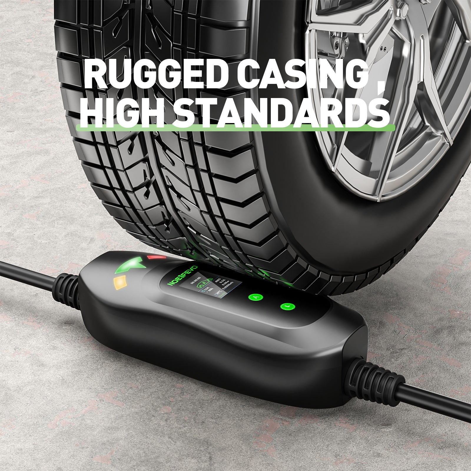 Das NOEIFEVO Ladegerät ist CE-zertifiziert und verfügt über einen integrierten RCD typB (Fehlerstromschutzschalter) zum Schutz vor Leckströmen. Darüber hinaus bietet das Produkt 10 zusätzliche Schutzfunktionen: Unterspannung, Überspannung, Überstrom, Leckstrom, Kurzschluss, Überhitzung, flammhemmend, Erdung, CP-Anomalie und Überspannungsschutz. Diese Sicherheitsfunktionen garantieren Ihnen eine rundum sichere Laderfahrung.